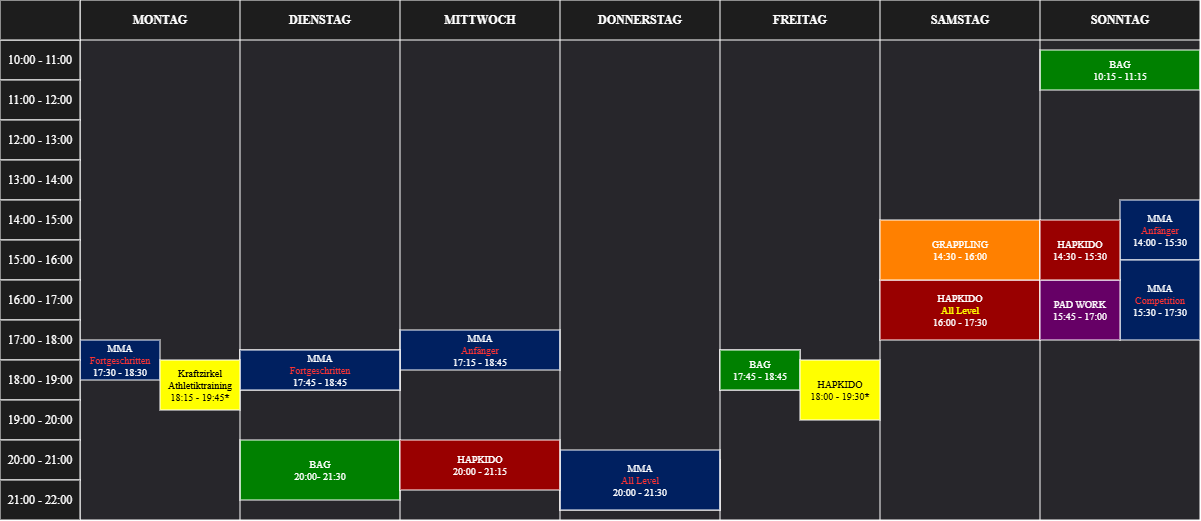 Hier findest du einen Überblick über unser Kursangebot. Wir freuen uns, wenn Du für ein kostenloses Probetraining vorbeikommst!